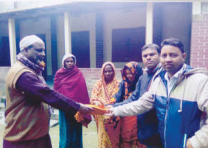 শীত বস্ত্র বিতরণ করছেন জনাব মোঃ মোখলেছুর রহমান চপল (ডানে) টেরিটরি অফিসার, নজিপুর টেরিটরি, নওগাঁ ও জনাব মোঃ খায়রুল বাসার, স্বত্বাধিকারী, মেসার্স কৃষি বীজ ভান্ডার, ধামইরহাট, নওগাঁ।